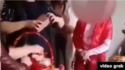 На видео, попавшем в Фейсбук, девочке набрасывают на плечи красный платок. Уже в этом платке, чуть позже, она выносит к праздничному столу поднос с чаем. Раздает стаканы.