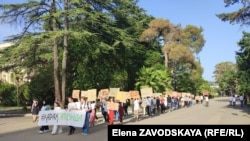 Молодежная группа «ҲАРАҲПИЦУНДА» организовала шествие по центральным улицам города, чтобы выразить свой протест в связи с соглашением по передаче дач в Пицунде России и привлечь к проблеме внимание депутатов парламента.