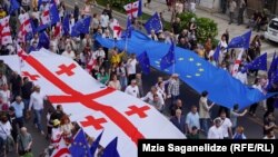Завершилось шествие в парламенте. Вдоль его фасада депутаты партии «Лело» развернули гигантские флаги Грузии и Евросоюза.