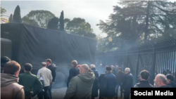 Протестующие у парламента самопровозглашенной республики Абхазия с помощью машины снесли часть забора и проникли на территорию, прилегающую к зданию.