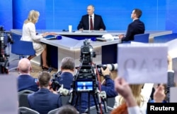 Пресс-конференция президента России Владимира Путина, посвящённая итогам года, проходит в Москве в Гостином дворе. Как и в прошлом году, она совмещена с так называемой «Прямой линией».